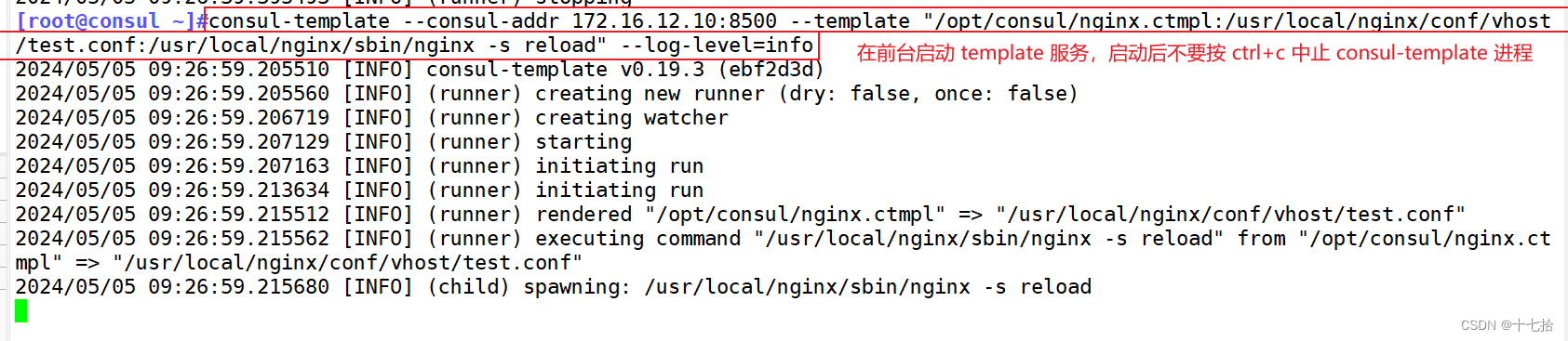 #在前台启动 template 服务,启动后不要按 ctrl+c 中止 consul-template 进程