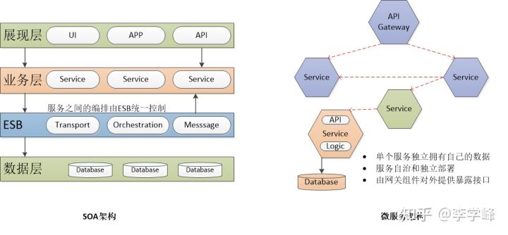 - SOA设计架构强调分层,通常会分为展现层、业务层、总线层和数据层。微服务架构中的服务更松散。
