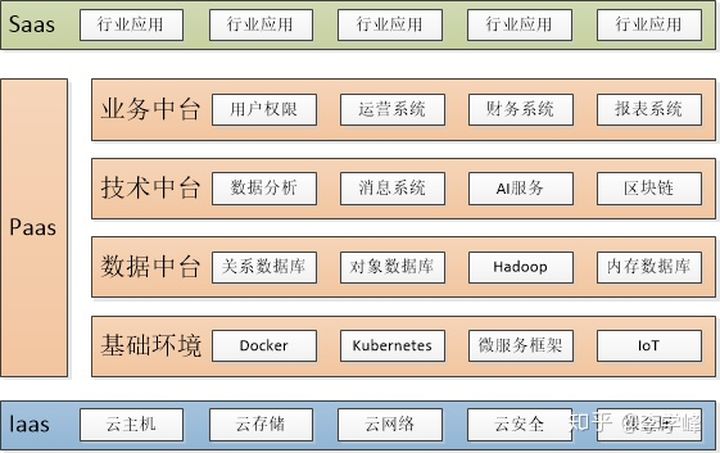 SaaS层是直接面向业务用户的,Iaas层是应用运行的底层物理资源,中间的PaaS是应用运行的标准平台,它包括基础数据库服务、基础中间件服务、基础开发框架和开发套件、应用部署、管理和运维服务。通过PaaS平台这一层,SaaS层更专注于自身的业务实现,运行平台和运行中间件由PaaS层提供。