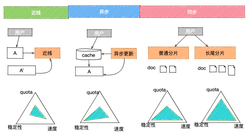 在相同的时间点,通过对整个搜索服务集群的计算任务分类,也存在可以挖掘优化的空间。具体任务类型包括:近线任务、异步任务、同步任务。