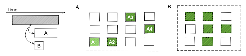 我们考虑这样一个场景,如下trace图,某个服务并行访问A、B两个下游,A的响应时间更长一些,所以提升A的性能可以缩短上层服务时间。但如果B中更快的容器(绿色)比A更多,则系统整体性能就不是最优的。这是通过增加A的快速容器让A算得更快,可以缩短整体响应时间。