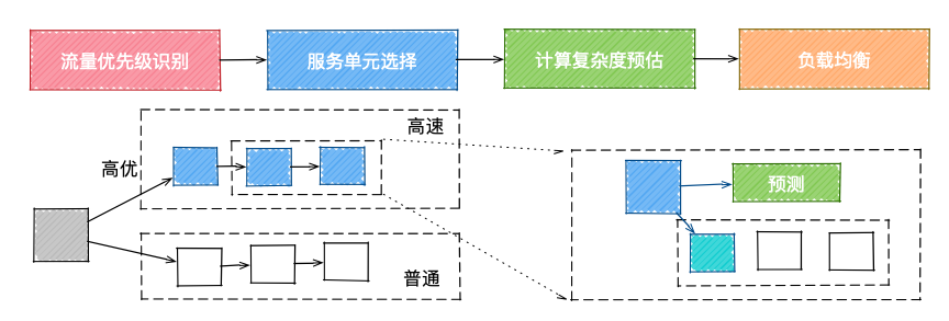 完成分档后,可通过更精细的流量调度,高效使用不同分档的容器。我们将服务分为高速单元和低速单元,高速单元部署在快速容器上,低速单元部署在低速容器上。处理请求时,首先进行流量类型识别,高优流量路由到高速服务单元上,再预估请求的计算复杂度,把更复杂的计算发送到更快容器上,进一步提升请求的计算速度。