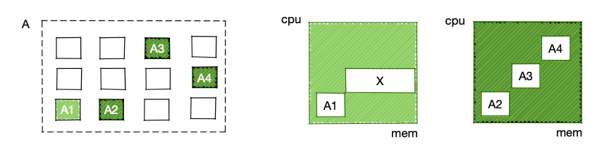 容器运行相同计算任务的速度,受宿主机硬件性能和硬件状态影响。根据宿主机的硬件性能对容器运行计算任务的速度进行划分,我们定义为静态分档;根据容器宿主机的硬件状态对容器运行计算任务的速度进行划分,我们定义为动态分档。如下图所示,部署在相同快速硬件型号上的A1~A4容器,A1容器因宿主机资源较空闲,计算速度更快。
