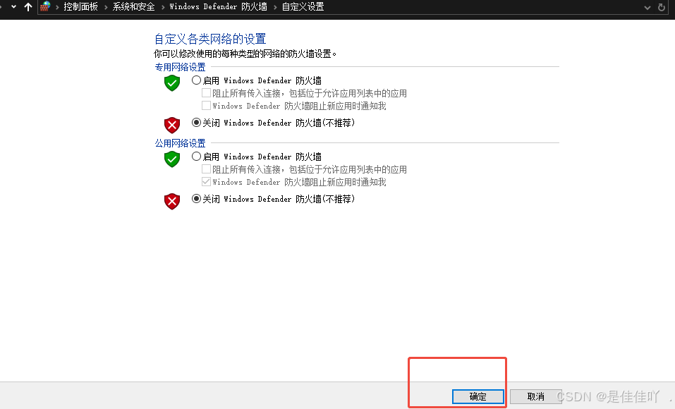 控制面板----防火墙---左边菜单启动或者关闭防火墙,全部关闭,和图片一样,点击确定。