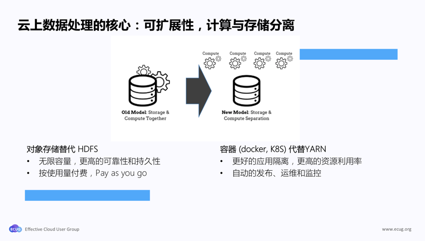 另外一个是在整个资源管理上,一般来说云上现在更多的是用 Kubernetes ,你在 Hadoop 里还得去做选型,很复杂。还有其他一些问题,其中最重要的一点叫存储与计算分离,不能说老是往云上方放数据,如果老板已经让你买了几千台机器,放在机房里不用,是沉没成本,但是放在云上就不一样了。
