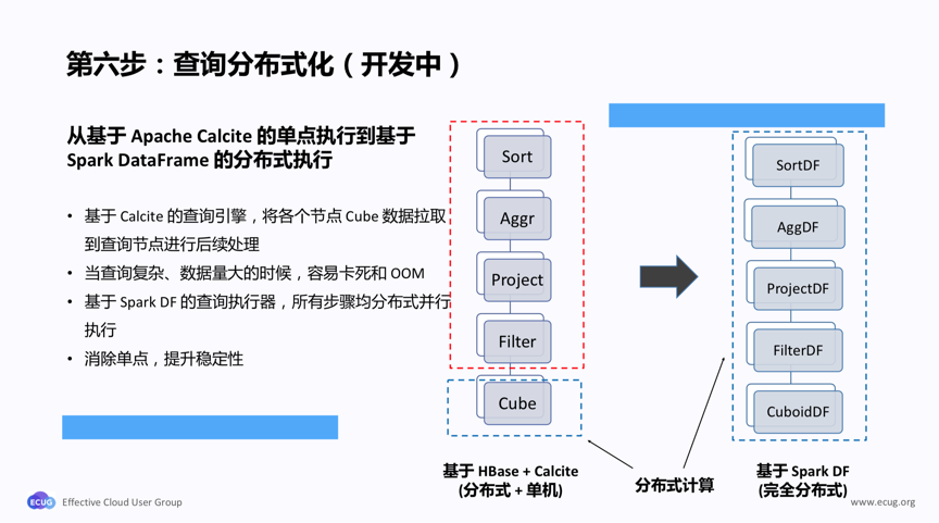 我们现在花了巨大的力气把它改成了 Spark 的方式,完全变成分布式的。变成这个以后,你会发现以前 cube 是因为存在 HBase 上,它是分布式的,所以我能够在各个节点把数据拉回来。收集完各个节点数据进行 Filter 开始就慢了,因为是单线程的。所以我们改变了一个方式,现在完全是用分布式了,所以你可以看打在上面的 sort 都是分布式的,你不需要在一个进程进行大量数据的 sort。这个情况,今天很多客户说在 Kylin 的节点上会去做优化,但是有时候不能解决性能瓶颈,只有这种分布式方式去做才能根本上解决性问题。但是这块的坑更大,因为这里面太复杂了。我们现在花很多力气,现在也在开发和测试,我们在看是不是可以和社区一起去做,我们把大部分的东西已经做完了。