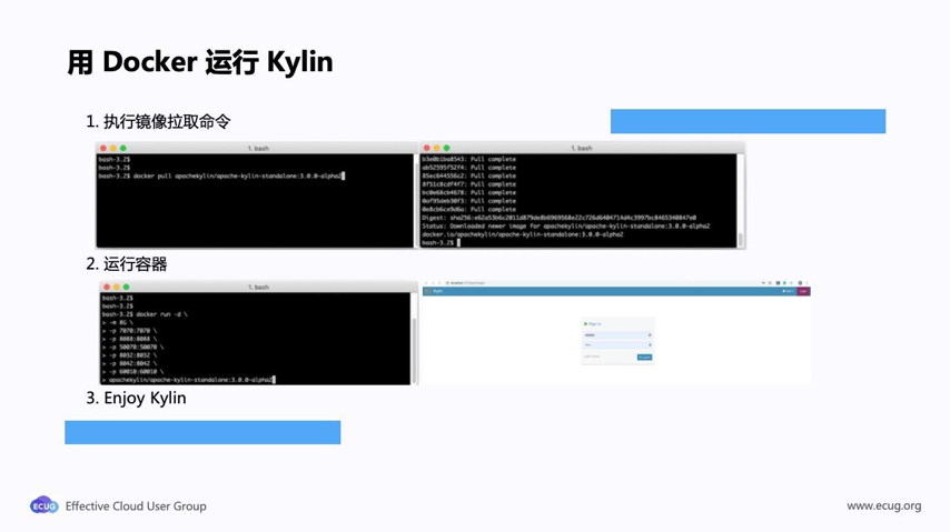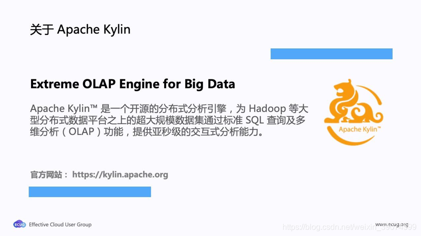 Apache Kylin 是做什么的?它是一个分布式引擎,为 Hadoop 等大型分布式数据平台之上的超大规模数据集通过标准 SQL 查询及多维分析(OLAP)功能,提供亚秒级的交互式分析能力。也就是数据集很大的情况下,业务人员需要快速分析的时候,需要这么一个数据集市的解决方案,把数据汇总好,能够让你的业务人员用起来很快很爽,而不是让他再跑一个脚本。