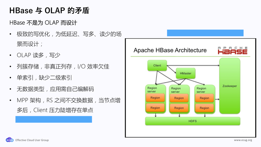 当时,我们发现 Kylin 的存储 HBase 也有巨大的挑战。它的挑战在于不是一个真正的列存,它可以很好地写优化,但是整个索引等等都有很大的挑战,而且运维相当困难。当然现在已经很好了,我们最早用 v0.98,那时候整个挂掉都是很正常的。另外一个是它缺乏二级索引,HBase 今天的版本里面依然没有很好的二级索引。我如果做查询,只做一个维度上的高查询,是可以做到的,但是业务用户永远不是这么想的。包括无数据类型等等,都有很大的挑战。而且放在云上面的挑战更大,日积月累以后数据占用的资源就很大了。我不是说它不好,它还是相当不错的。