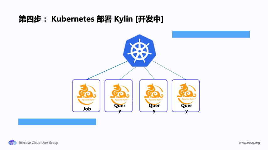 怎么用 Kubernetes 去管理所有跟 Kylin 相关的东西,这是非常重要的。尤其在云上的时候,我们自己的云版本已经做到自动伸缩了,也就是说我可以在数据量进来之后,通过规则对资源的使用去做伸缩。这个得益于整个 Docker 化和 Kubernetes 化,可以做自动化的编排。