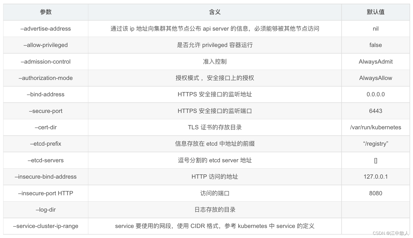 API Server 主要是和 etcd 打交道,并且对外提供 HTTP 服务,以及进行安全控制,因此它的命令行提供的参数也主要和这几个方面有关。下面是一些比较重要的参数以及说明(不同版本参数可能会有不同):