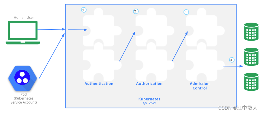 认证之后的请求就到了授权模块。跟认证类似,Kubernetes 也支持多种授权机制,并支持同时开启多个授权插件(只要有一个验证通过即可)。如果授权成功,则用户的请求会发送到准入控制模块做进一步的请求验证;而对于授权失败的请求则返回 HTTP 403.