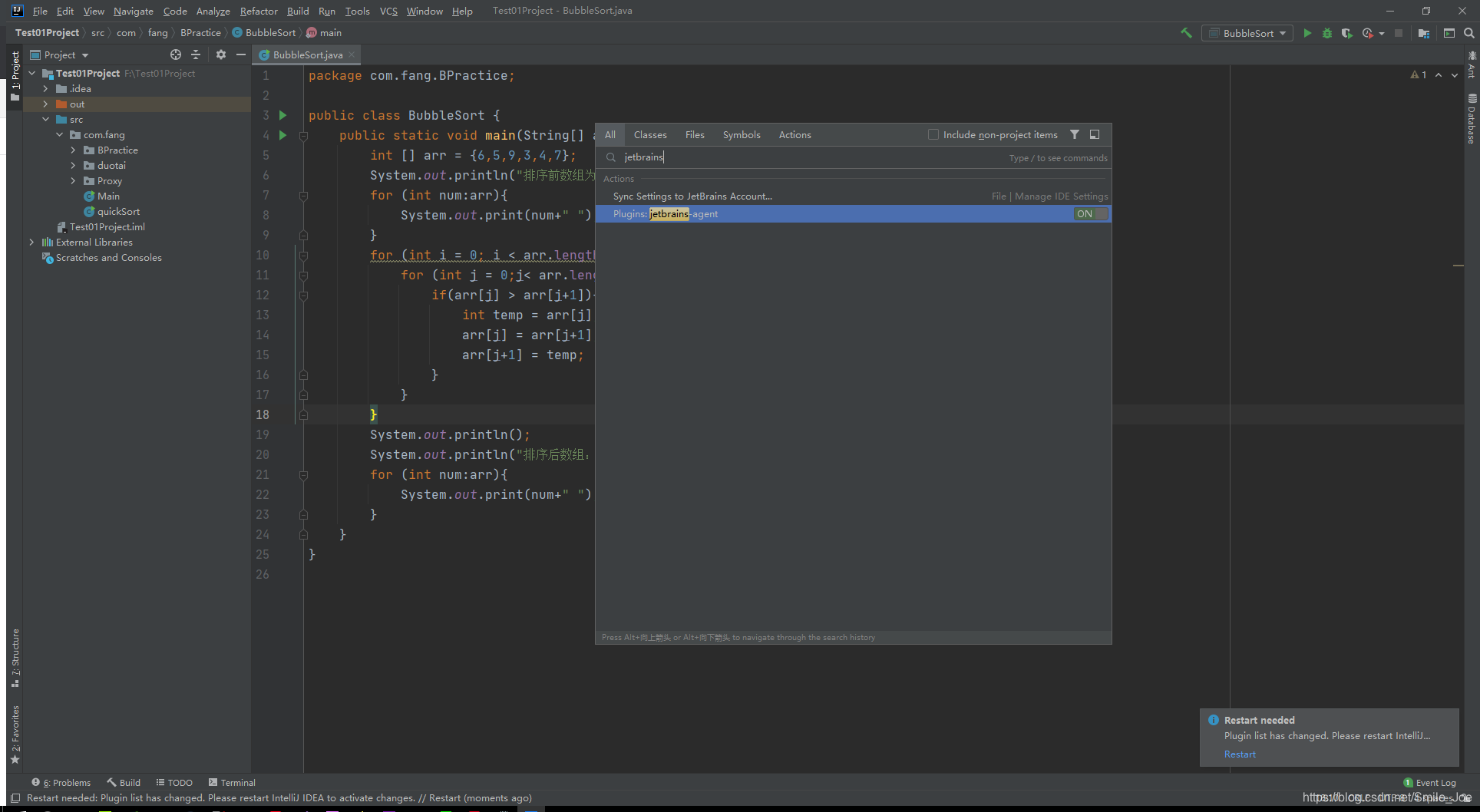 2.输入关键字jetbrains,选择点击第二项jetbrains-agent,后面的ON变为OFF,右下角弹出提示插件有变化,重启一下IDEA