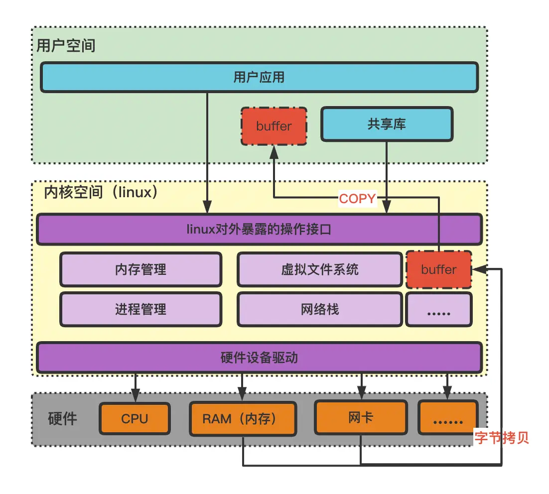 linux系统也是一种应用,它是基于计算机硬件的一种操作系统软件。当我们接收一次网络传输,计算机硬件的网卡会从网络中将读到的字节流写到linux的buffer缓冲区内存中,然后用户空间会调用linux对外暴露的接口,将linux中的buffer内存中的数据再读取到用户空间。这一次读操作就是一次IO。同样写也是这样的。