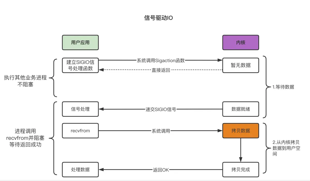 应用程序可以创建一个信号驱动程序SIGIO,当数据没有处理好时,应用程序继续运行,不会被阻塞。当数据准备好之后,操作系统向应用程序发送信号,之后信号驱动程序就会执行,在信号处理函数中调用 IO函数处理数据。过程如下所示:
