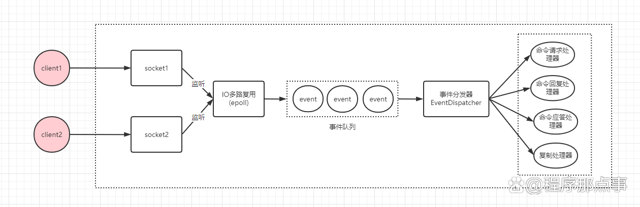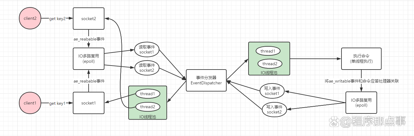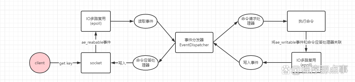 在linux下,IO多路复用程序使用epoll实现,负责监听服务端连接、socket的读取、写入事件,然后将事件丢到事件队列,由事件分发器对事件进行分发,事件分发器会根据事件类型,分发给对应的事件处理器进行处理。我们以一个get key简单命令为例,一次完整的请求如下: