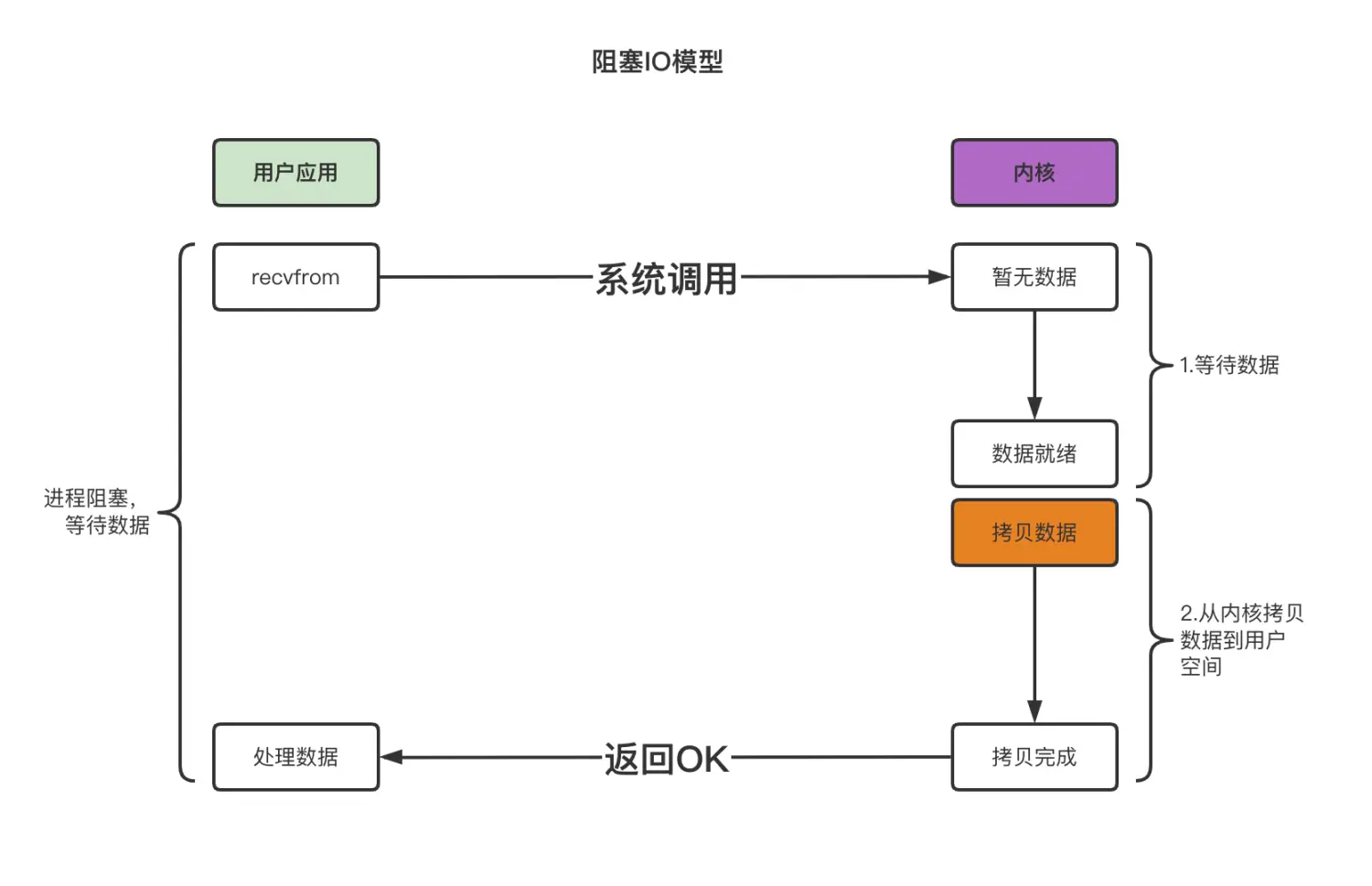 当应用程序调用一个 IO 函数,其底层会委托操作系统的recvfrom()去完成,当数据还没有准备好时,revfrom会一直阻塞,等待数据准备好。当数据准备好后,从内核拷贝到用户空间,recvfrom 返回成功,IO函数调用完成。过程如下所示: