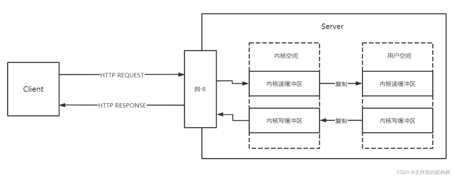 IO一般分为磁盘IO和网络IO,这里我们主要关注网络IO。一次完整的网络IO过程如下所示: