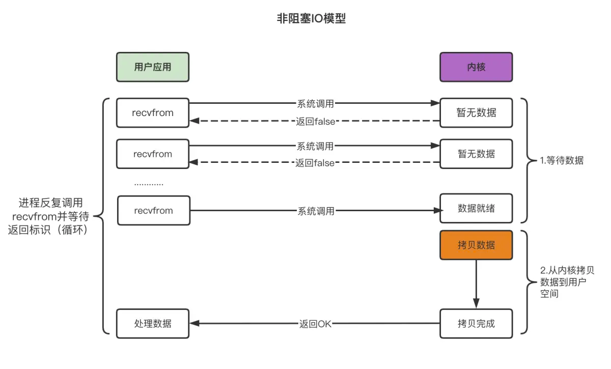 调用进程在等待数据的过程中不会被阻塞,而是会不断地轮询查看数据有没有准备好。当数据准备好后,将数据从内核空间拷贝到用户空间,完成IO函数的调用。等待数据的过程是非阻塞的,但数据拷贝时仍是阻塞的。过程如下所示: