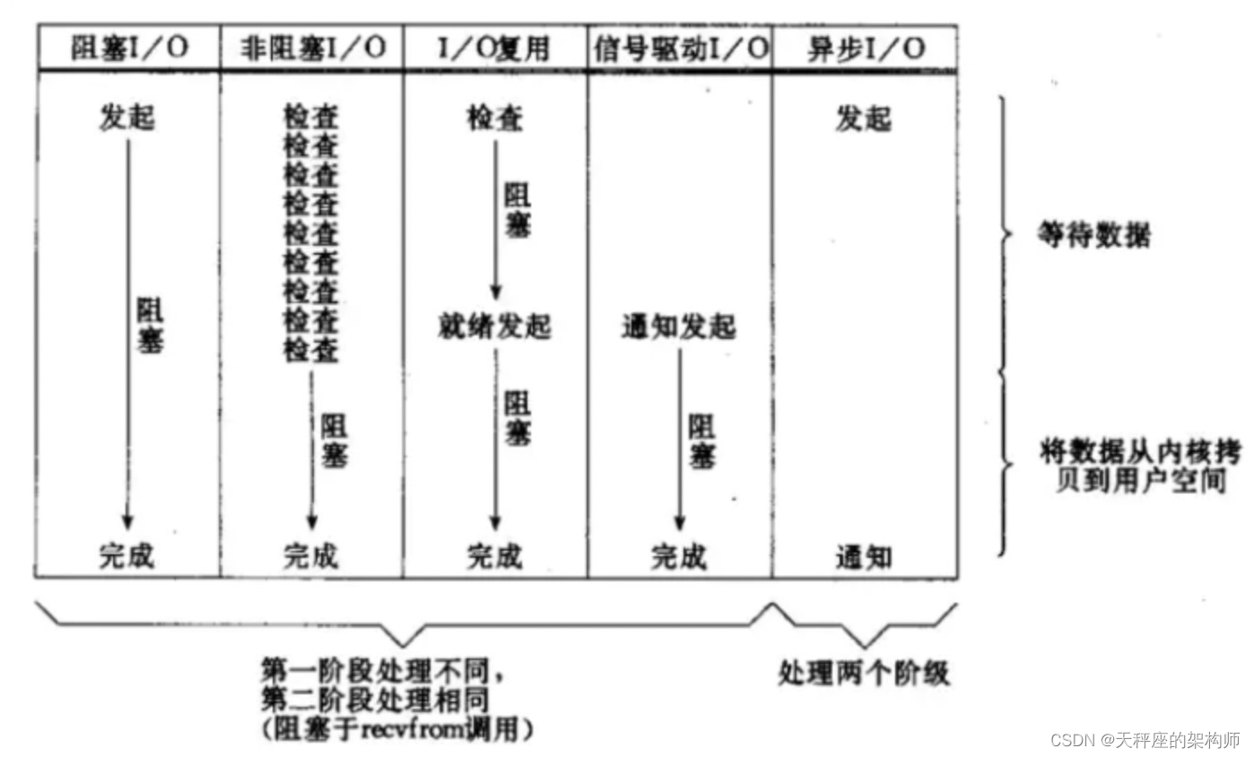 IO模型共有五种,前四种模型区别在于第一部分,即系统调用,但是第二部分都是一样的,即将数据从内核空间拷贝到用户空间这个过程,进程阻塞于redvfrom的调用。而最后一种,异步IO模型,在系统调用和数据拷贝过程都是非阻塞的。