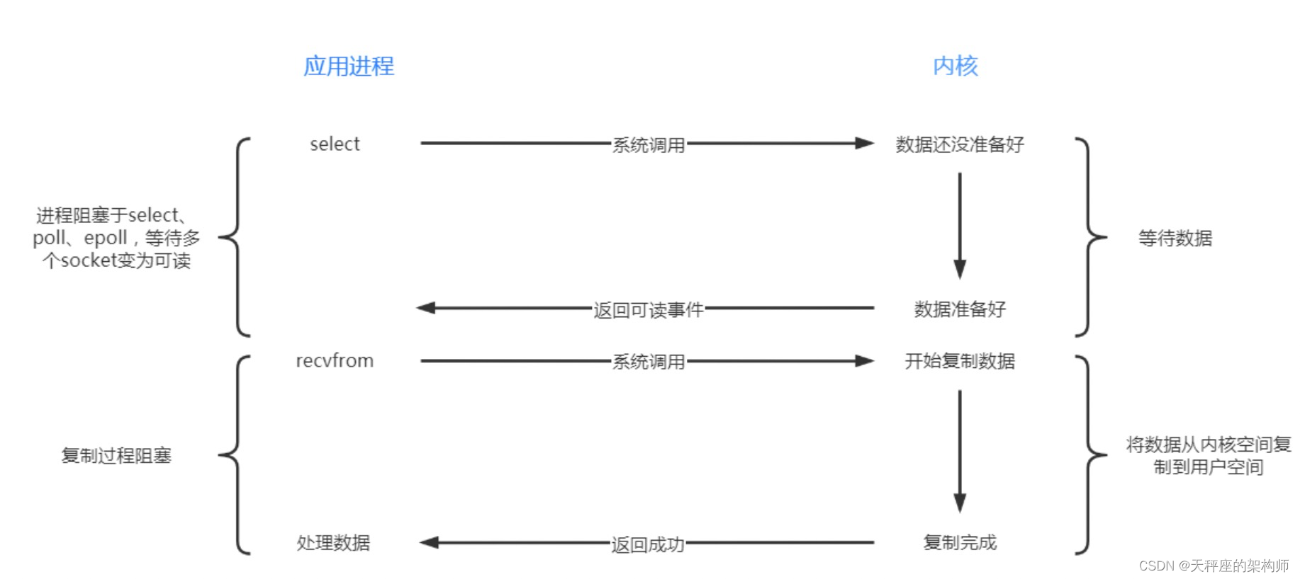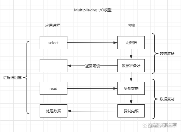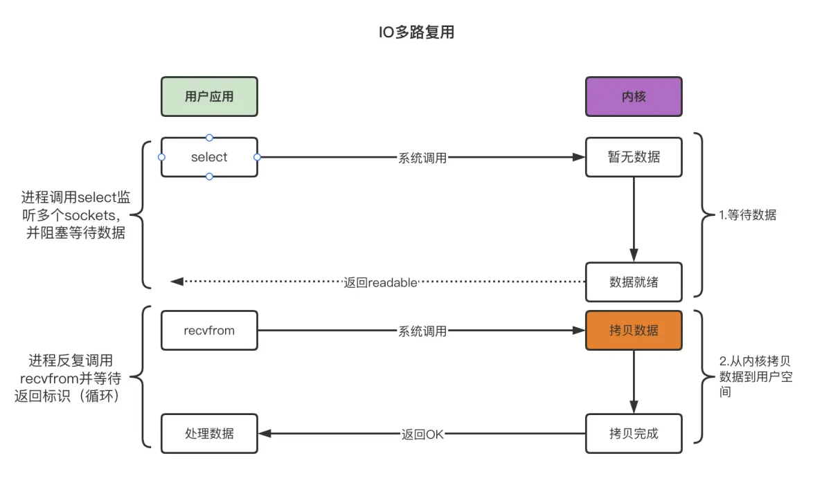 用户应用线程调用select函数去监听多个FD文件描述符,如果没有数据,还是要等待,如果有就绪的文件FD,说明有数据,那就去读对应的FD就绪的文件数据,此时内核会将文件FD集合拷贝到用户内存中,然后去遍历FD集合,找到可以读数据的FD,然后再去读取,读完了之后会将FD的集合再拷贝到内核内存中。