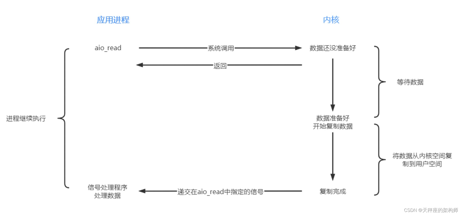 相比于同步IO,异步IO不是顺序执行的。应用进程在执行aio_read系统调用之后,无论数据是否准备好,都会直接返回给用户进程,然后应用进程可以去做别的事情。当数据准备好之后,内核直接复制数据给用户进程,然后内核向进程发送通知。过程如下:
