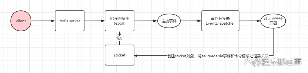 命令应答处理器创建socket对象,将ae_readable事件和命令请求处理器关联,交由IO多路复用程序监听。