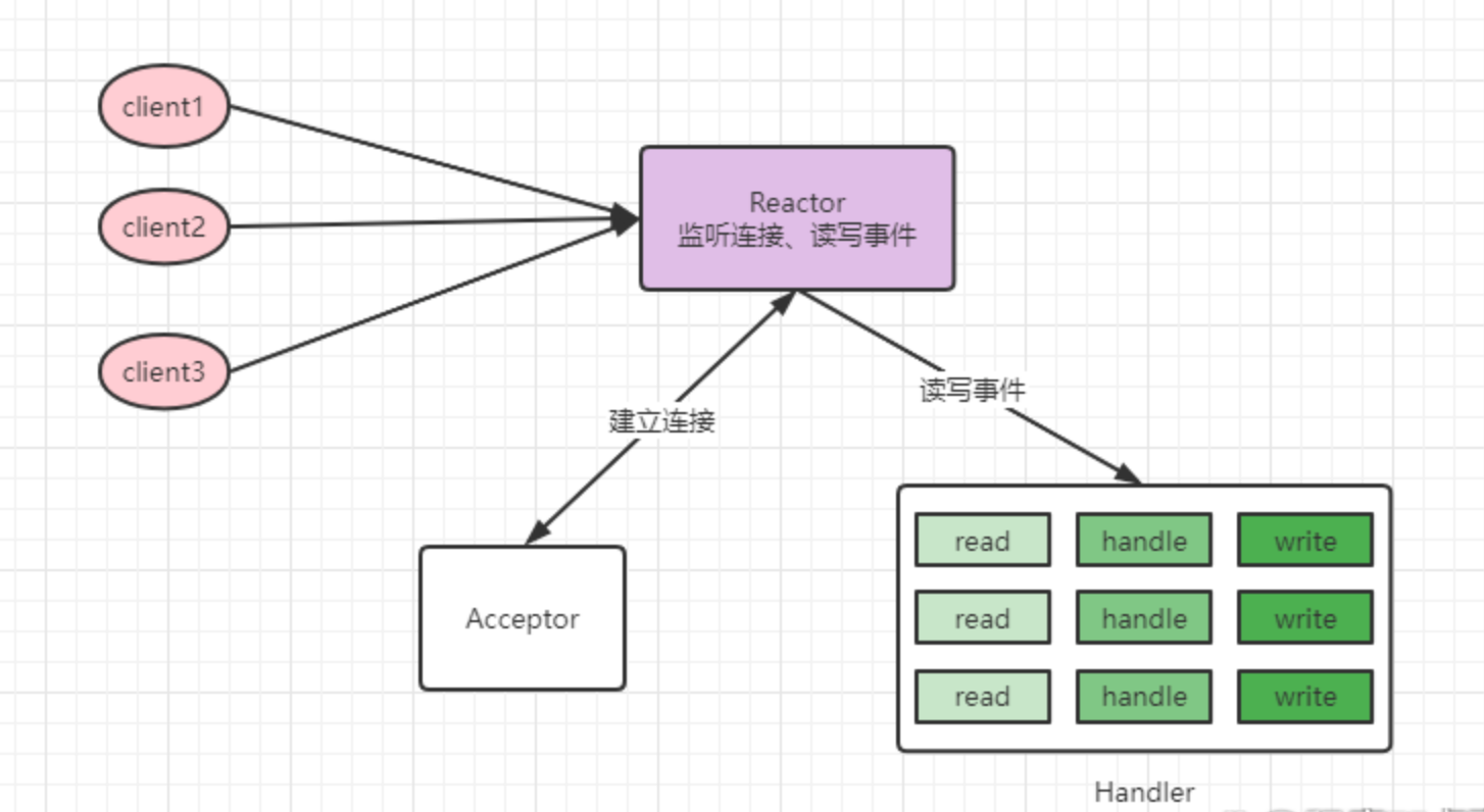 redis网络IO模型底层使用IO多路复用,通过reactor模式实现的,在redis 6.0以前属于单reactor单线程模式。如图: