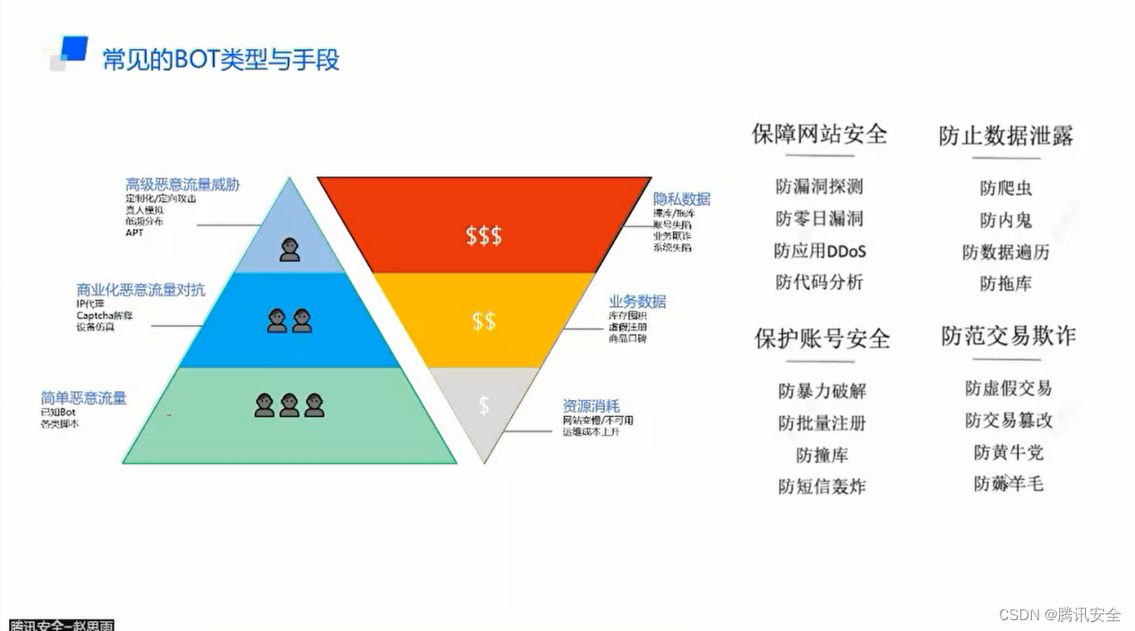 一、攻击呈现服务化、产业化,上下游产业链持续丰富;新兴的云函数,serverless、云真机等技术,让攻击者使用资源成本更低。一些服务商也会为攻击者提供商业化的恶意BOT工具,形成了密切配合的上下游产业链。