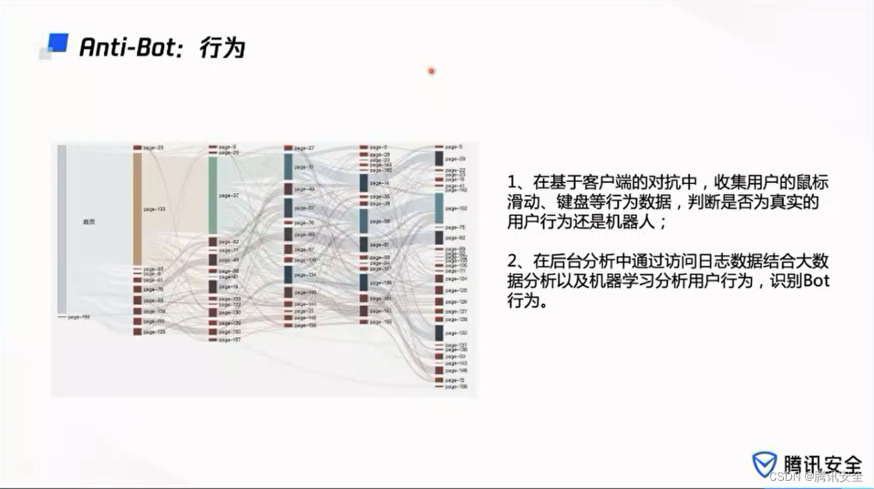Anti-BOT在行为方面,会基于客户端的对抗,收集用户的鼠标滑动、键盘灯行为数据,判断是否为真实的用户行为还是机器人;同时在后台分析中通过访问日志数据结合大数据分析以及机器学习分析用户行为,识别BOT行为。