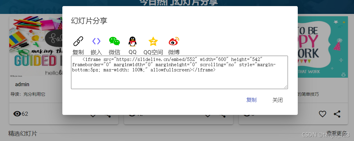 步骤二:点击指定幻灯片的"分享"按钮,选择选择"嵌入",复制代码