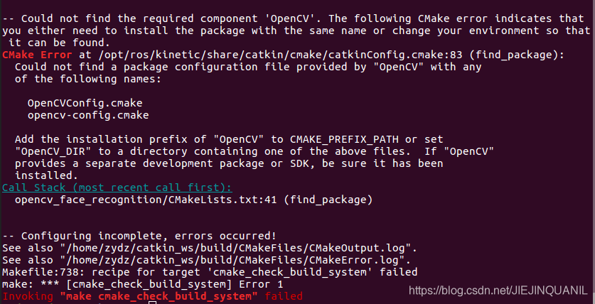 问题描述:在ROS上使用OpenCV实现人脸检测的过程中,遇到如下的问题:这个问题困扰了好久,后来发现是CMakeLists.txt文件没有写正确。错误的写法:find_package(catkin REQUIRED COMPONENTS OpenCV)这样写会导致编译出现--Could not find ...