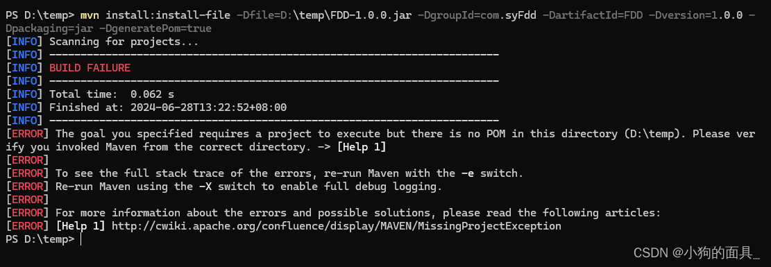 然后,打开终端,执行maven命令: mvn install:install-file -Dfile=D:\temp\FDD-1.0.0.jar -DgroupId=com.syFdd -DartifactId=FDD -Dversion=1.0.0 -Dpackaging=jar -DgeneratePom=true
