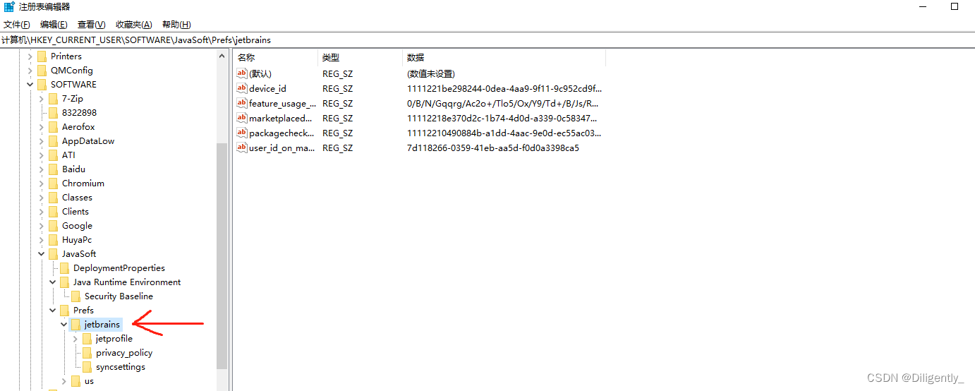 按住win键+r 输入regedit 找到下面的位置:计算机\HKEY_CURRENT_USER\SOFTWARE\JavaSoft\Prefs\jetbrains