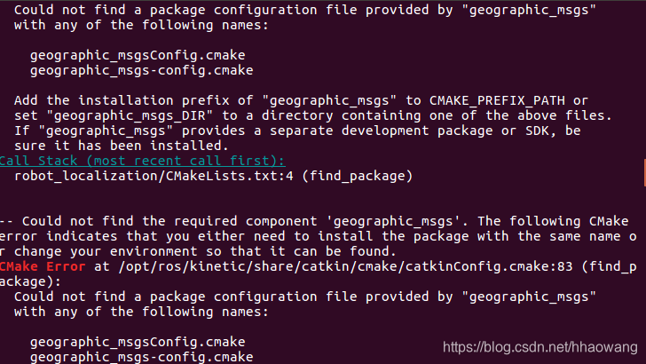 ROS 学习笔记(11)编译错误 Could not find a package configuration file provided by "geographic_msgs"
