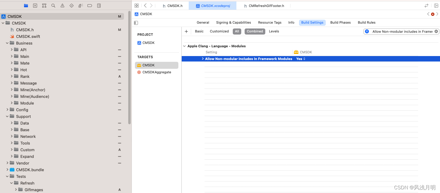 Include of non-modular header inside framework module 'CMSDK': '/Users/hivpn/Documents/CMSDK/CMSDK/CMSDK/Tests/Refresh/CMRefreshGifFooter.h'1.Build Settings中的Allow Non-modular includes in Framework Mo