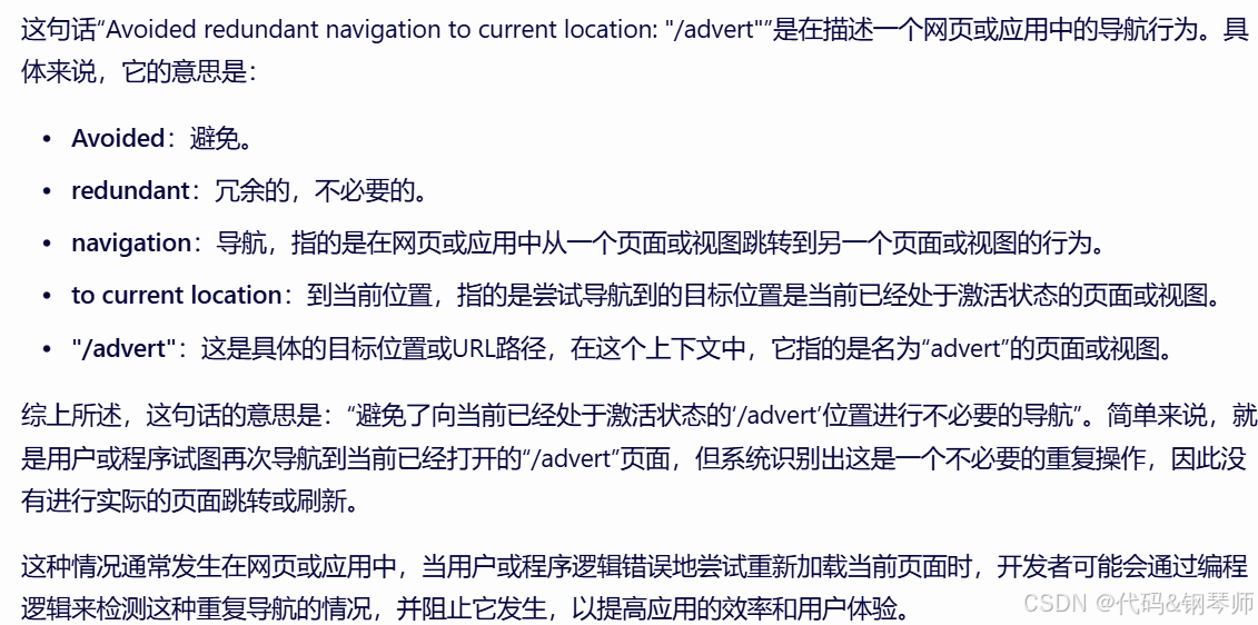 最近做一个项目遇到的问题:vue-router.esm.js:1710Uncaught (in promise) NavigationDuplicated: Avoided redundant navigation to current location: "/".点击同一个路由操作,控制台会报错。这是Vue Router的一个预防措施,用来避免不必要的DOM更新,从而提高应用的性能。
