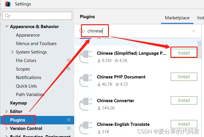 2、在弹出的“Settings”对话框的左侧列表中点击“Plugins”,在右侧的搜索栏输入“chinese”,点击“Chinese(simplified) Language p...”后的“install”,等待安装完成。