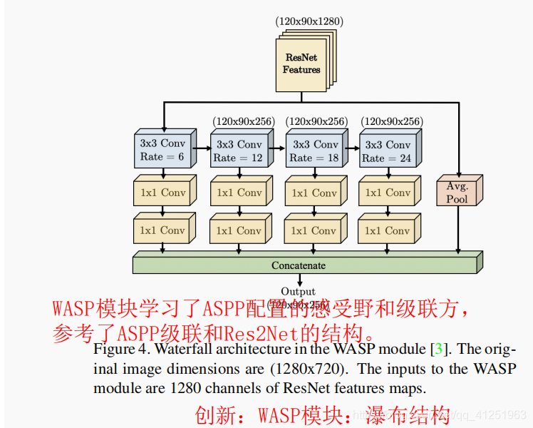 WASP依赖于ASPP基础的atrous卷积来维持较大的FOV。 WASP还以级联方法激发了级联的atrous卷积,以提高效率。此外,WASP融合了Res2Net架构和其他多尺度方法所使用的多尺度特征。 与ASPP和Res2Net相比,WASP不会立即并行化输入流。 相反,它首先通过卷积过滤器进行处理,然后创建一个新分支,从而创建瀑布流(waterfall flow)。 WASP还超越了级联方法,它结合了其所有分支的流和原始输入的平均池化以实现多尺度表示。