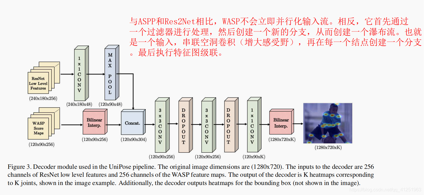 WASP的设计目标是减少参数数量以应对内存限制并克服 WASP中的四个分支具有不同的FOV,并且以瀑布状的方式排列。 WASP中的atrous卷积以6的小比率开始,此比率在随后的分支中不断增加(6、12、18、24的比率)。 由于较小的滤波器尺寸,此配置可提高效率,并与每个分支组合创建多尺度特征以获得更丰富的表示。 WASP模块在图2的UniPose架构中用于姿势估计。