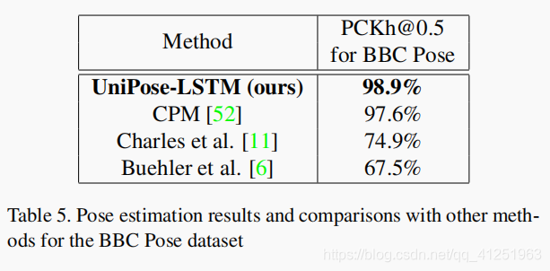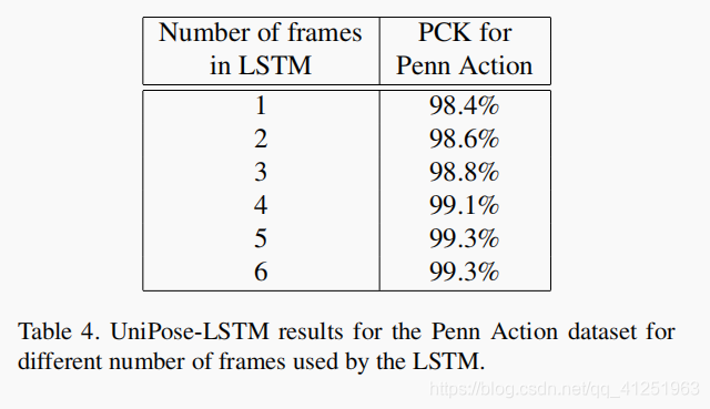 对于视频处理,利用连续帧之间的相似性和时间相关性是很有用的。要在视频处理模式下运行,UniPose体系结构将通过一个LSTM模块进行增强,该模块可接收前一帧的最终热图以及当前帧的编码器热图。 UniPose-LSTM的pipeline如图5所示。该网络包括LSTM之后的CNN层,以生成用于联合检测的最终热图。UniPose-LSTM结构允许网络使用先前处理的帧中的信息,而不会显着增加网络的总大小。 对于单一图像和视频配置,网络使用相同的ResNet-101主干网,WASP模块和解码器。 当对多个帧使用LSTM时,作者评估了由于内存组件的时间长度而导致的性能优势。 实验确定,在LSTM中合并多达5个帧时,精度会提高,并且在其他帧中,精度会达到稳定水平。
