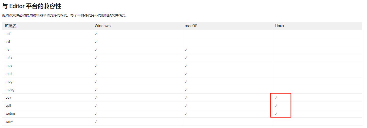 官方文档:视频文件兼容性 - Unity 手册