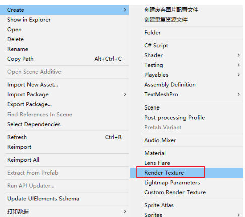 右键Assets文件夹或任意文件夹→Create→Render Texture纹理渲染