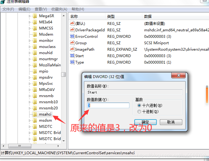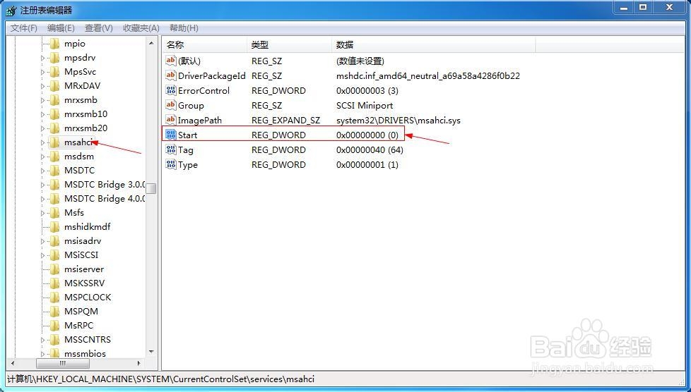 找到:HKEY_LOCAL_MACHINE/System/CurrentControlSet/Services/Msahci