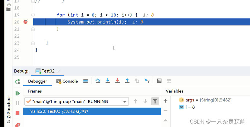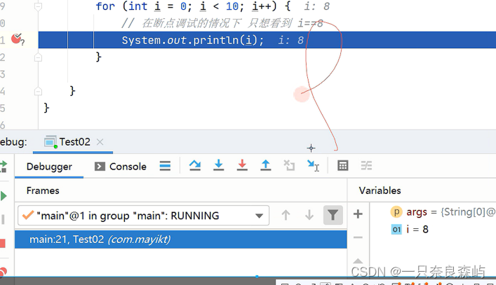 注意:先设置断点,如何将光标移至断点出,右击然后增加设置i==8即可,注意:如图所示,会一次一次的执行,直至第8次结束。意思就是:for循环十次。然后就直接看到第八次的结果。