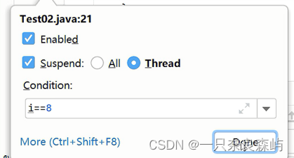 注意:先设置断点,如何将光标移至断点出,右击然后增加设置i==8即可,