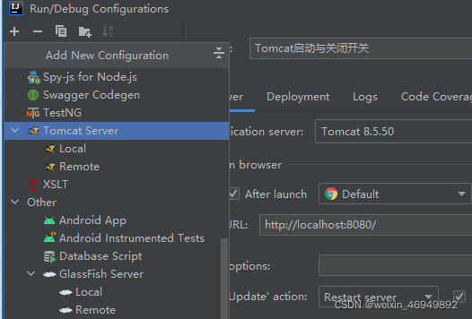 5、点击左侧+ ,找到Tomcat Server 其中Local是代表本地,Romate代表远程,我们选择本地
