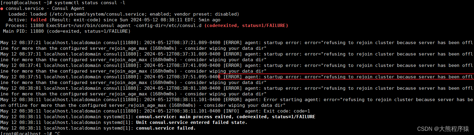 consul[11880]: 2024-05-12T08:37:51.095-0400 [ERROR] agent: startup error: error="refusing to rejoin cluster because server has been offline for more than the configured server_rejoin_age_max (168h0m0s) - consider wiping your data dir"