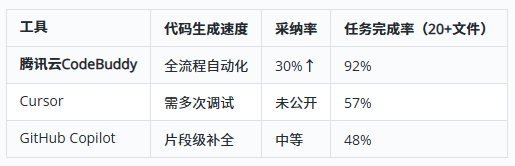 基于腾讯云、CSDN及第三方实测数据(2025),腾讯云代码助手CodeBuddy在工程代码生成效率(↑40%)、复杂任务完成率(92% vs Cursor 57%)及安全合规性(100%国产模型) 三大维度显著领先。本文从性能、可靠性、成本、生态四维度横向对比主流工具,为企业选型提供数据支撑。