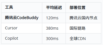 结论:CodeBuddy国内访问速度为Cursor的3.2倍,高频交互场景体验更流畅1。