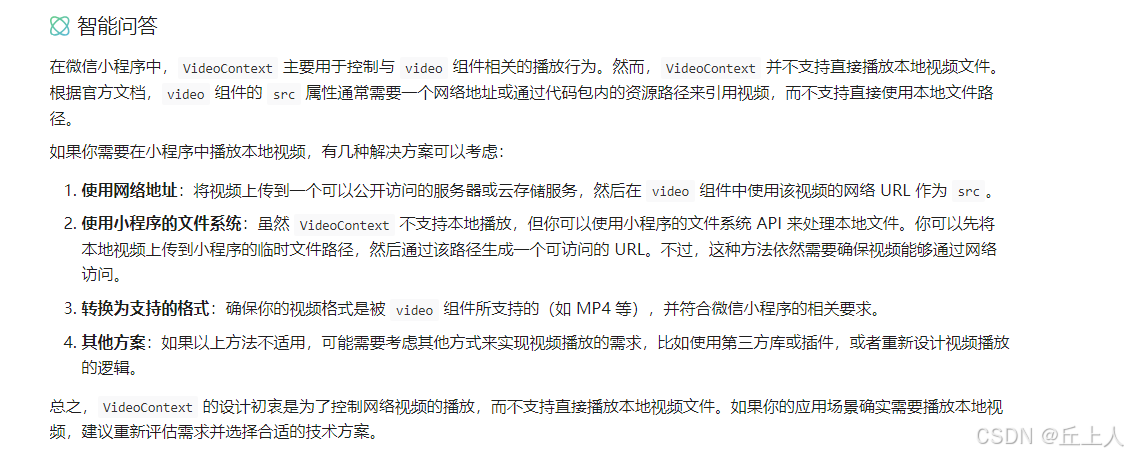 总之,VideoContext 的设计初衷是为了控制网络视频的播放,而不支持直接播放本地视频文件。如果你的应用场景确实需要播放本地视频,建议重新评估需求并选择合适的技术方案。
